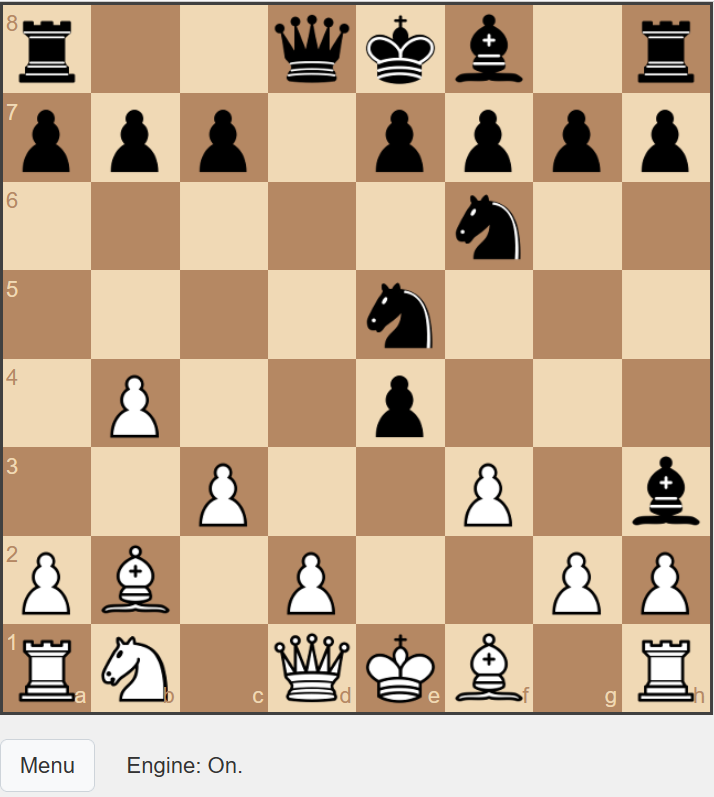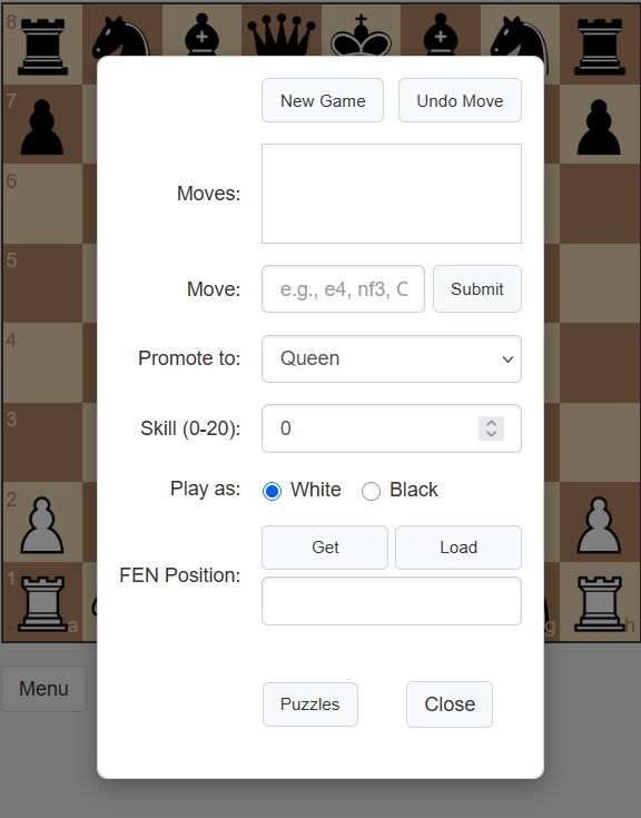 The objective is timeless: outmaneuver the AI opponent and deliver checkmate. The primary challenge comes from Stockfish v11. The user interface has a number of features, including movement of pieces by drag-and-drop operations and a menu with options, such as an undo of prior moves and for starting a new game at a preset skill level. For advanced study, there is an option for loading/saving the game board state in FEN notation format, which is accessible by copy/paste of text. The current match is also stored in the browser, so as long as this "local storage" is not erased, the match can be resumed at a later time.