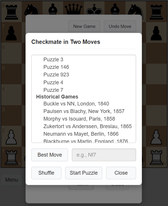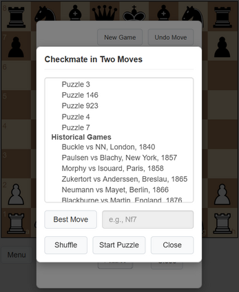 There is a shuffle menu option in the puzzles section to randomize for a selection of 50 of these curated puzzles. They are displayed in the list box before the historical sample. The refresh function in the browser is another way to activate this randomization. Each puzzle record is assigned a unique number for reference and its FEN notation may be retrieved and reloaded under the menu options.